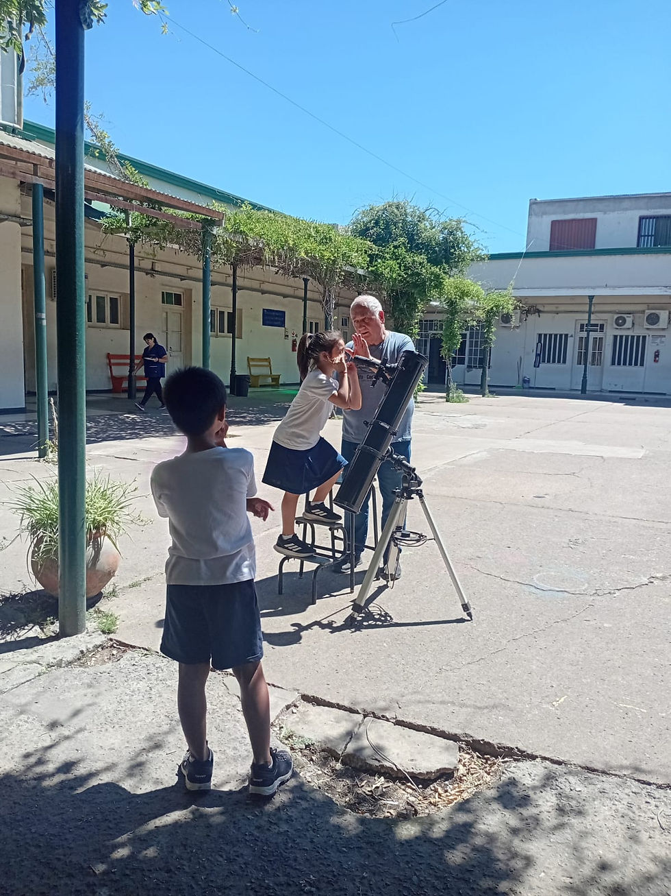 El señor Juan Carlos Dovis explicó las características del planeta Tierra, los astros que la rodean, sus movimientos y curiosidades. Con instrumentos adecuados, los alumnos participaron en diversas actividades y pudieron observar las manchas solares.